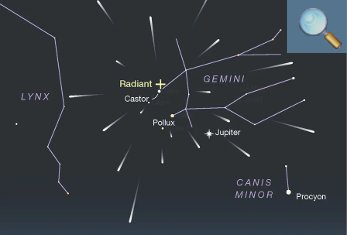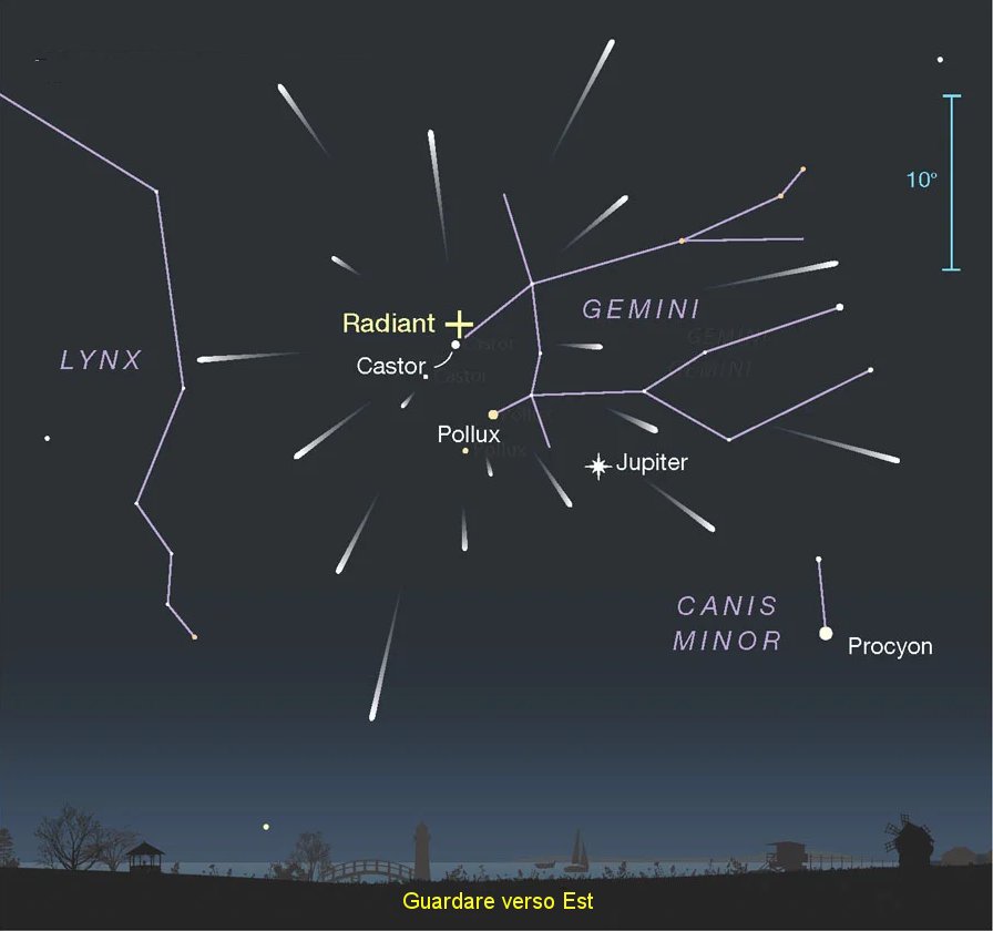 Il radiante delle Geminidi (adattato da S&T) Rullo di tamburi, prego. Nella notte tra il 13 e il 14 dicembre, lo sciame meteorico annuale delle Geminidi raggiungerà il suo culmine e impreziosirà il cielo con frammenti dell'asteroide 3200 Phaethon. Sempre che la meteo lo permetta, naturalmente! Lo scorso anno la Luna quasi piena ha brillato per tutta la notte, cancellando gran parte dello spettacolo. Questa volta invece la Luna sarà una sottile falce illuminata al 26%, che sorgerà accanto alla stella più luminosa della Vergine, Spica, intorno alle 2:30 ora locale. Condizioni quasi ideali.