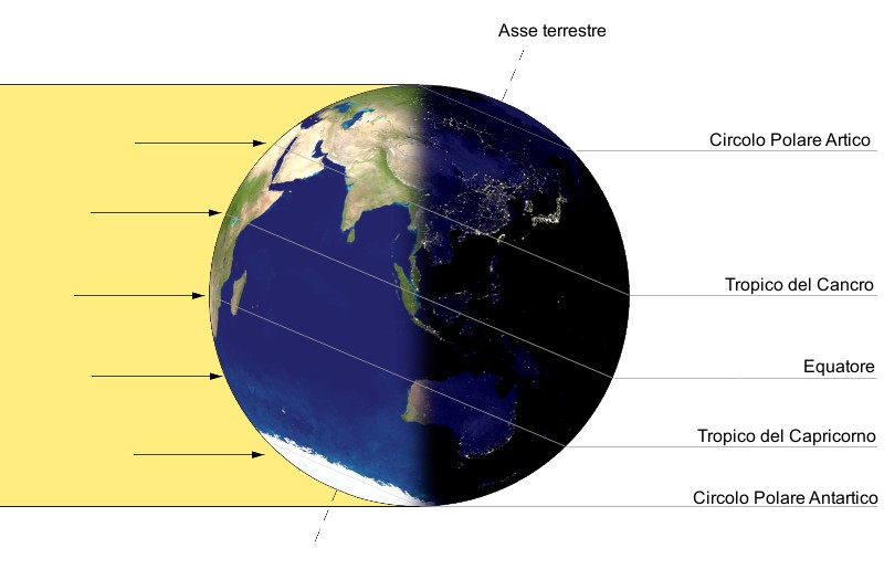 Illuminazione solare durante il solstizio d'inverno boreale (adattato da Wikipedia)