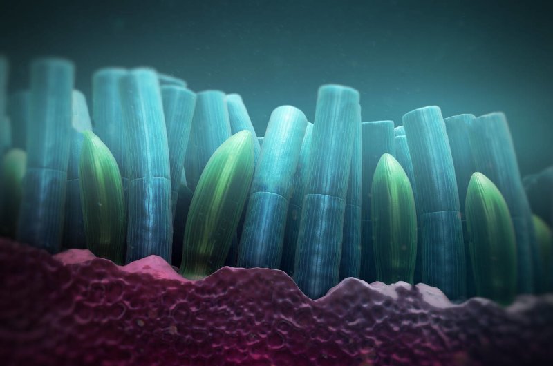 A noi interessa la parte posteriore dove si addensano i fotoricettori, ossia i coni, attivati in visione diurna, e i bastoncelli, più grandi, e maggiormente sensibili alla luce grazie a un pigmento particolare che li ricopre chiamato rodopsina o porpora retinica che si forma a bassissimi livelli d'illuminazione; sono quindi impiegati nella visione notturna, ma, a differenza dei coni, non sono sensibili ai colori (vedi la nota a piè pagina).