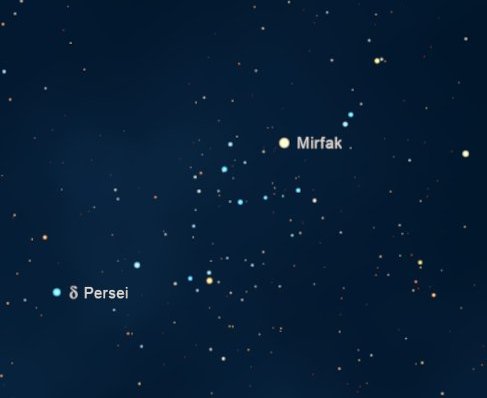 L'associazione Perseus III in un'immagine di Glem LeDrew L'agglomerato stellare che circonda Alfa Persei è perfetta- mente visibile da cieli suburbani e già in un modesto binocolo appare molto disperso; tuttavia non si tratta di un raggruppamento casuale, ma costituisce un'importante associazione stellare conosciuta come Perseus III (meno nota è invece l'altra denominazione, vale a dire Melotte 20, che ne rappresenta propriamente la parte più interna); queste associazioni sono formate prevalentemente da stelle azzurre appartenenti alle prime classi spettrali e sono quindi molto giovani e calde. Come abbiamo accennato parlando del Perseus, Mirfak appartiene all'associazione che conta una sessantina di componenti e ne è di fatto il membro più brillante, ma essendo molto massiccia si sta già evolvendo al di fuori della sequenza principale del gruppo: il suo spettro è infatti F5 ed è quindi una stella giallastra.