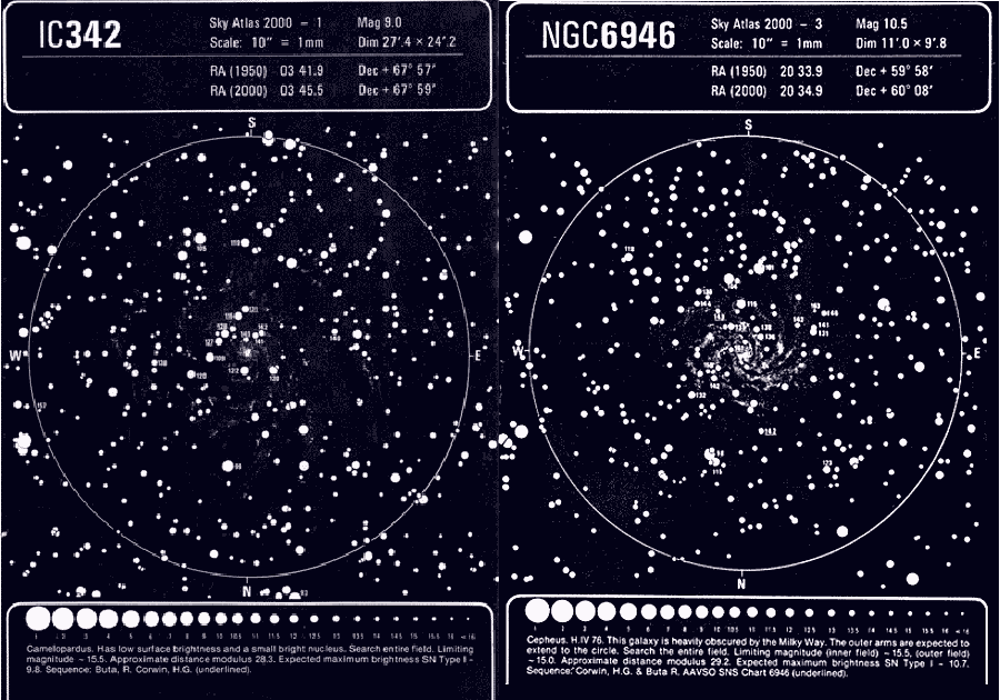 Il campione scelto con questi criteri non era in verità particolarmente nutrito: il numero di galassie che tenevo sotto controllo sistematico arrivava forse a 500, contro le 2000 circa di Evans (!), ma osservandole di frequente mi ero impratichito sia del loro aspetto visuale, sia delle conformazioni stellari presenti. Questo è molto importante quando si ha a che fare con oggetti tipo IC 342 in Camelopardalis o NGC 6946 al confine tra Cefeo e Cigno. Le prime volte che controllavo queste galassie mi sentivo prendere dallo sconforto: dovevo verificare una per una le decine di stelline di campo presenti nell'oculare; mi ci voleva moltissimo tempo, se si considera che il mio dobsoniano, come del resto la maggior parte di questi telescopi, è totalmente privo di moto orario, per cui bisogna continuamente correggere il puntamento e a quasi 300 ingrandimenti non era certo comodo. Col tempo, però, avevo imparato a suddividere le numerose stelline in piccoli asterismi che potevano quindi essere più facilmente memorizzati, con gran risparmio di tempo. Ricordo che durante una gelida notte invernale al Passo S. Marco, il principale avamposto mio e di Stefano durante la ricerca, ero riuscito a controllare 317 galassie. Mi sembravano davvero tante, prima d'aver saputo che il reverendo Evans, in una notte, ne aveva osservate il doppio!