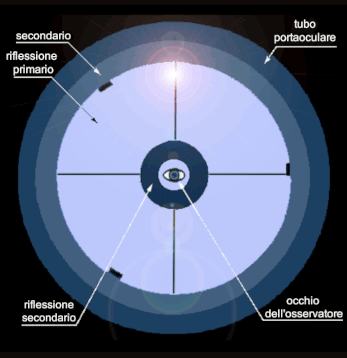 Centraggio di un telescopio Quando appaiono le prime stelle in cielo è il momento di controllare sia l'allineamento del cercatore, sia quello delle ottiche: il primo è importante per trovare gli oggetti senza far troppa fatica, il secondo per penetrare a fondo nell'osservazione dei dettagli. Si tratta comunque di operazioni che si possono, a grandi linee, effettuare anche di giorno: per quando concerne il cercatore indirizzandolo su un oggetto lontano (ad esempio il campanile di una chiesa); per l'allineamento è sufficiente osservare attraverso il portaoculari le riflessioni dei due specchi come nell'immagine riportata, se il vostro newtoniano è aperto ad almeno F/6. Per quelli più spinti è necessario decentrare leggermente il secondario in direzione opposta a quella dell'oculare, il che porta al seguente risultato visivo; se infatti osservate la figura a fianco vi accorgerete che lo specchietto secondario, essendo inclinato di 45°, intercetta il fascio emergente dal primario in punti diversi: questa differenza si può considerare trascurabile negli strumenti a basso rapporto focale (F/7 o meno), ma non lo è più in quelli ad alto rapporto (F/5 o addirittura F/4, come molti dobsoniani di grandi dimensioni).