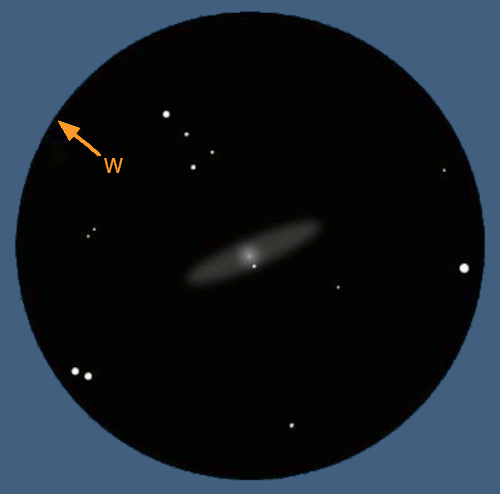 Spesso individuare un oggetto debole non è facile per una serie di motivazioni. Innanzitutto una galassia potrebbe essere molto disturbata dalla luce di una stella brillante situata nelle immediate vicinanze e che non si riesce a tener fuori campo neppure ad alti ingrandimenti. Nell'esempio riportato è difficile stabilire a prima vista se l'evanescente macchiolina rotonda indicata dalla freccia è effettivamente la galassia o un artefatto prodotto dalla stella. In questi casi conviene spostare molto lentamente il telescopio mentre si osserva: normalmente gli artefatti o scompaiono di colpo o diventano più vistosi; se la macchiolina invece si sposta coerentemente col movimento che impartite allo strumento si tratta sicuramente del vostro bersaglio. Nell'esempio riportato, poi, il compito è facilitato dalla presenza di una stellina a ridosso.